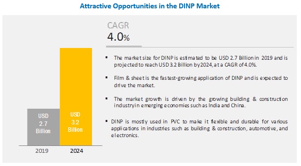 The DINP market size is estimated at USD 2.7 billion in 2019 and is projected to reach USD 3.2 billion by 2024, at a CAGR of 4.0%. The booming building & construction industry in the emerging economies in APAC and South America is are driving the DINP market. There is an increase in the demand for flexible PVC for various applications such as flooring & wall covering, wires & cables, films & sheets, coated fabrics, and consumer goods. Flexible PVC is used in various applications in the building & construction industry. PVC has high demand due to its properties, such as flexibility, durability, toughness, weather-resistant, thermal resistant, and processability. Stringent safety regulations related to the production of phthalate based plasticizers are restraining the growth of the DINP market.
