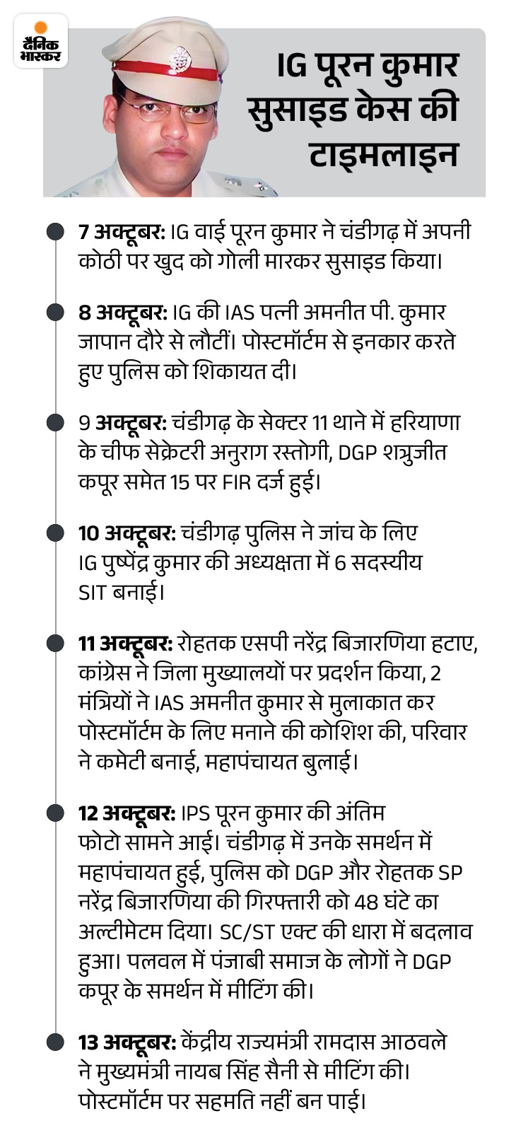 10 अक्टूबर: चंडीगढ़ पुलिस ने जांच के लिए SIT बनाई पूरन कुमार के सुसाइड के चौथे दिन चंडीगढ़ पुलिस ने IG पुष्पेंद्र कुमार के नेतृत्व में SIT बनाई। SIT में पुष्पेंद्र कुमार के अलावा, चंडीगढ़ की SSP कंवरदीप कौर, DSP चरणजीत सिंह विर्क, SP सिटी केएम प्रियंका, SDPO गुरजीत कौर और सेक्टर 11 थाने के SHO जयवीर सिंह राणा शामिल हैं।