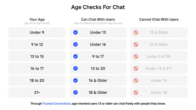 Once users complete an age check, they are assigned to one of six age groups: under 9, 9–12, 13–15, 16–17, 18–20, and 21+. By default, users in each age group can chat with users in the groups directly above and below theirs (i.e., users 9-12 can chat with users in their own group, as well as those in the under 9 and 13-15 groups.)